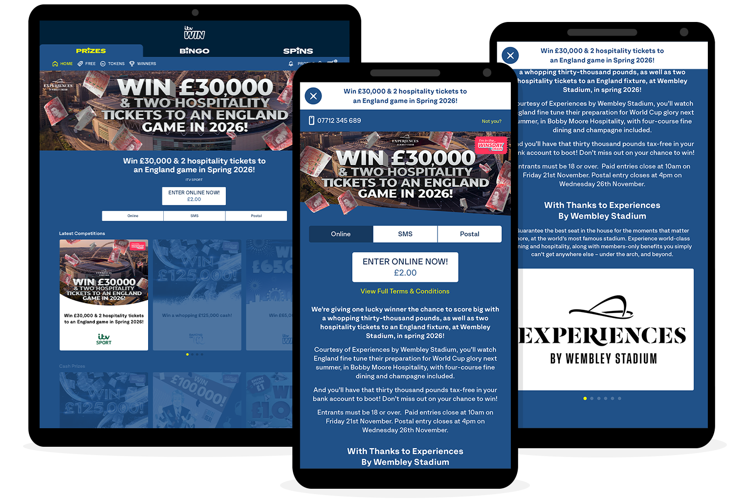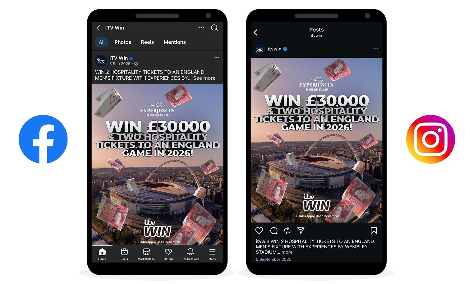 ITV Win ran a competition across the autumn England Men’s Qualifiers, giving viewers the chance to win £30k cash and two hospitality tickets to an England men’s fixture at Wembley in Spring 2026 courtesy of Experiences by Wembley Stadium. The competition was promoted during pre-match/post-match and half time commentary and Mark Pougatch voiced the competition VT to tie in with the programme. As well as organic social posts, Experiences by Wembley Stadium received opt-in data after the competition had closed.